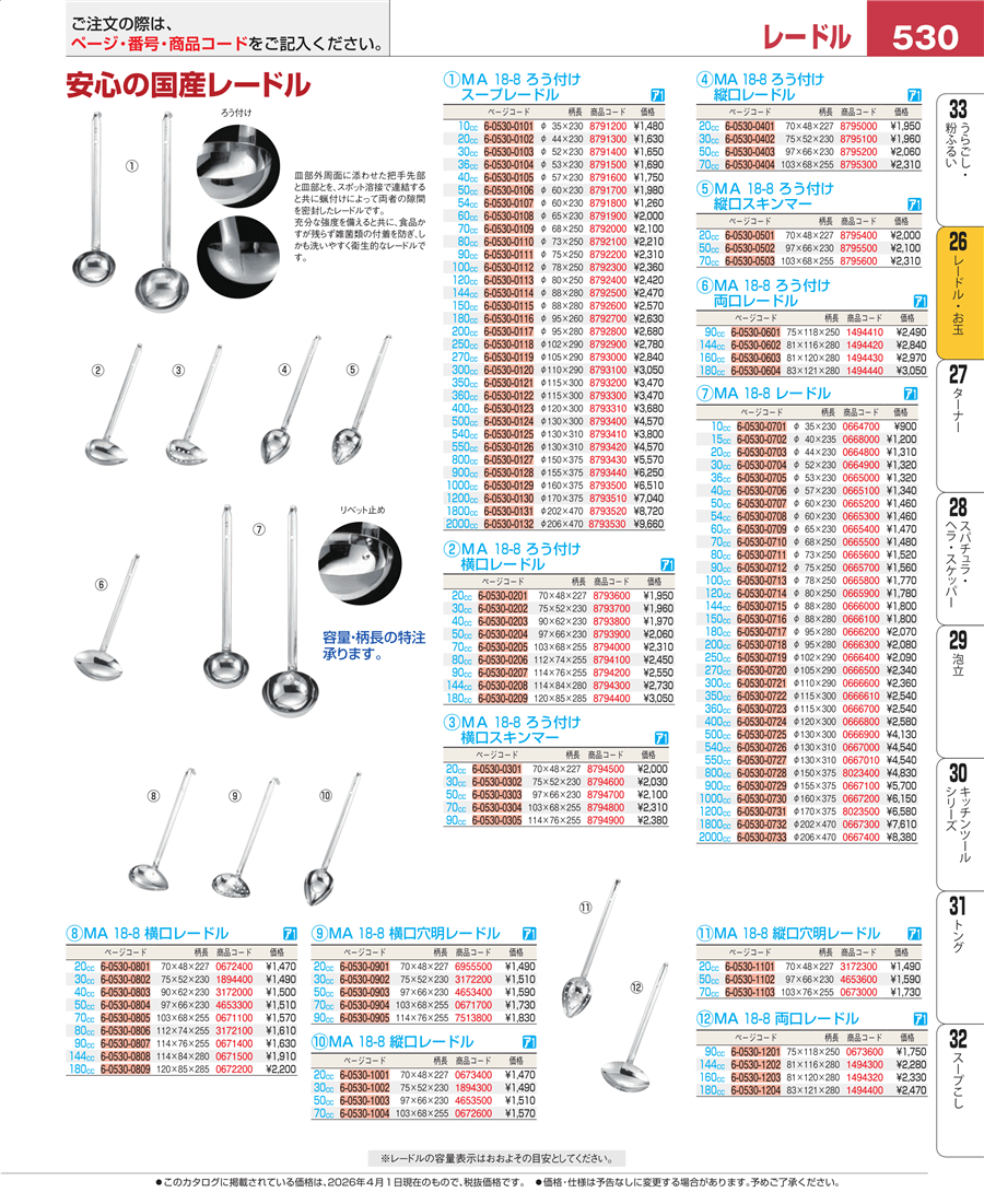 e26-3172200MA 18-8 横口 穴明レードル 30㏄上代 1,510円(税抜)