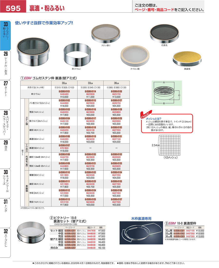 | e26-0448400 | ビクトリー 18-8 裏漉替アミ 荒目 24メッシュ 30㎝ | 上代 4,400円(税抜) 見積
