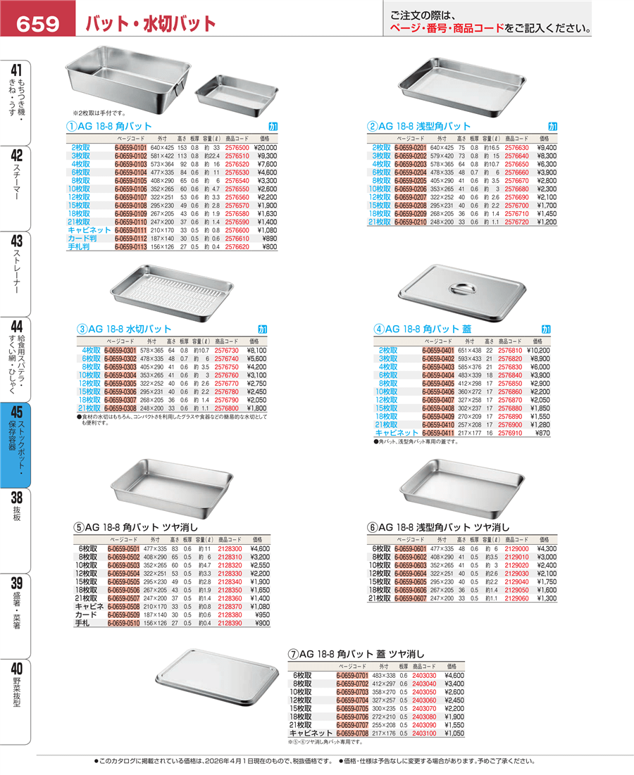 | e26-2403030 | AG 18-8 角バット 蓋 ツヤ消し 6枚取 | 上代 4,600円(税抜) 見積 | ||