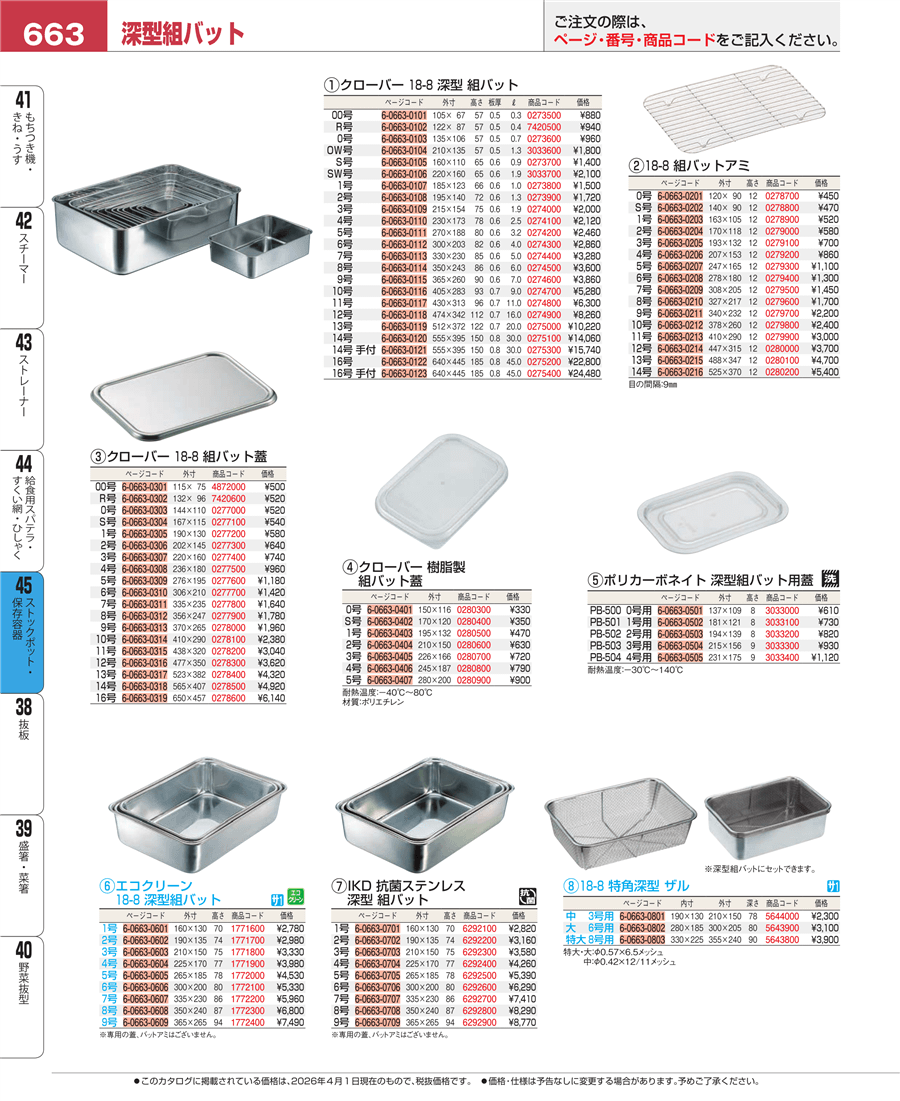 | e26-0274500-663 | クローバー 18-8 深型 組バット 8号 | 上代 3,600円(税抜) 見積 | ||