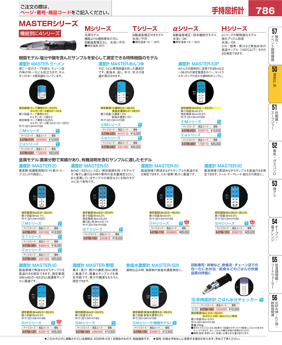 | e26-0415110 | 濃度計 MASTER-めんつゆ Mシリーズ 手持屈折計 | 上代 15,000円(税抜) 見積 | ||