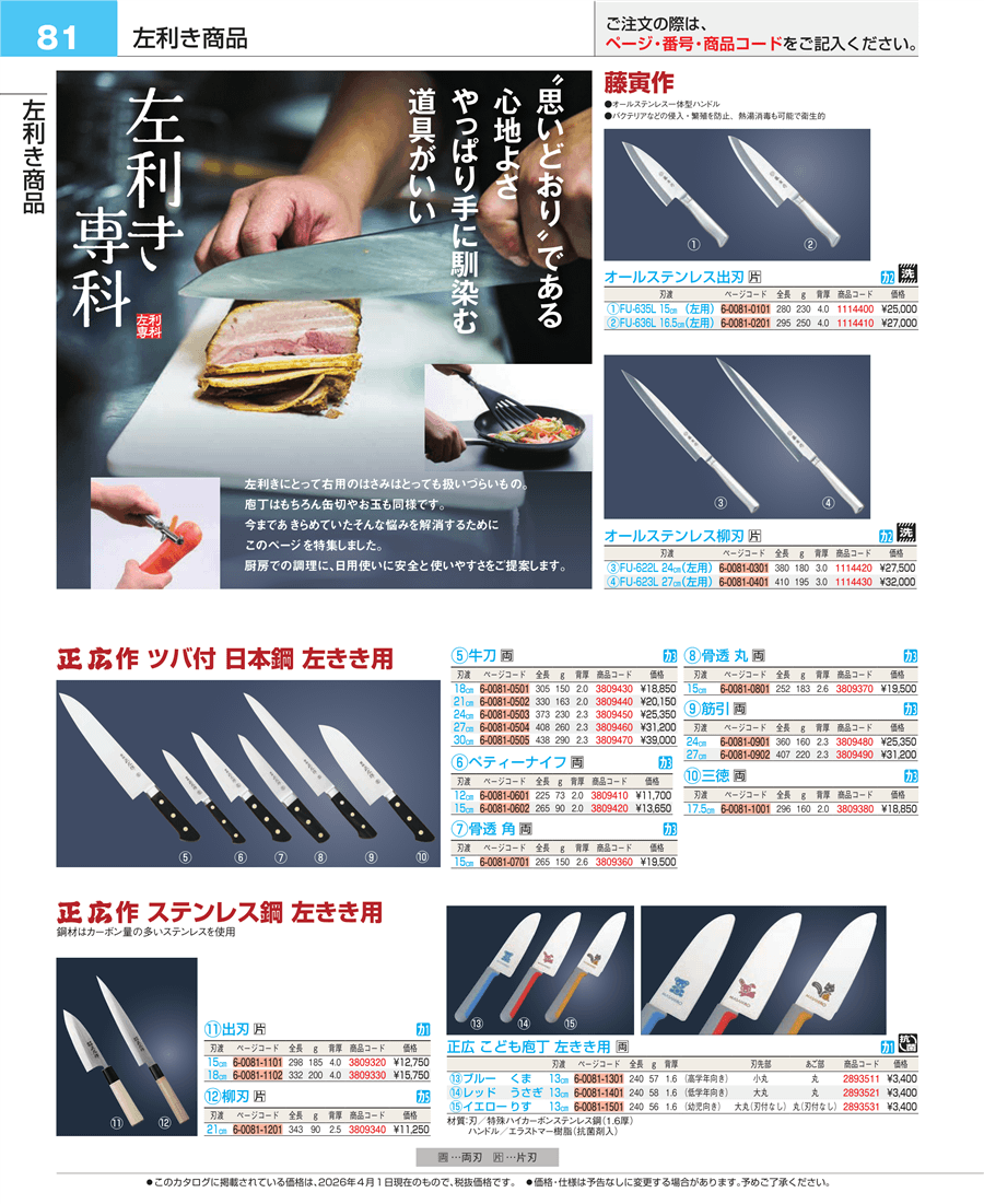 | e26-3809330 | 正広作 ステンレス鋼 左きき用 出刃庖丁 18㎝ MS-8 | 上代 15,750円(税抜) 見積 | ||