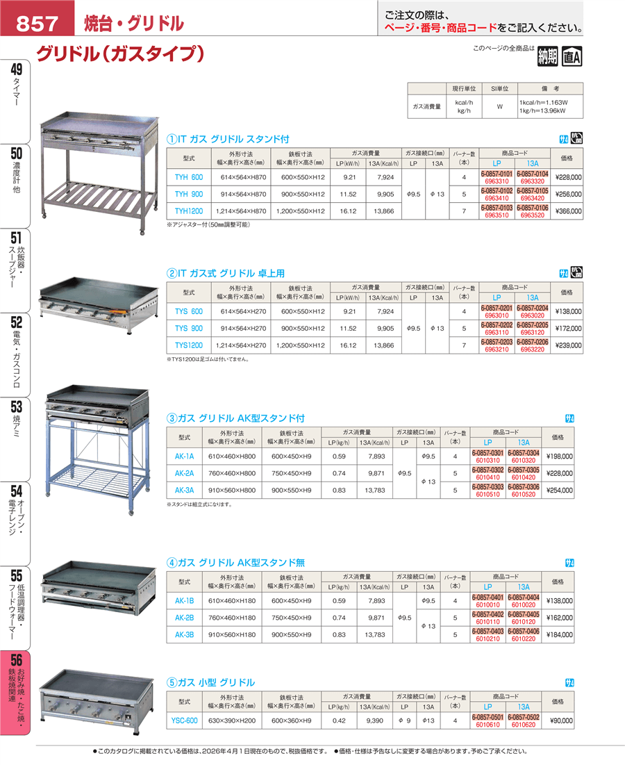 e26-6963020IT ガス式 グリドル 卓上用 TYS600 13A上代 138,000円(税抜)